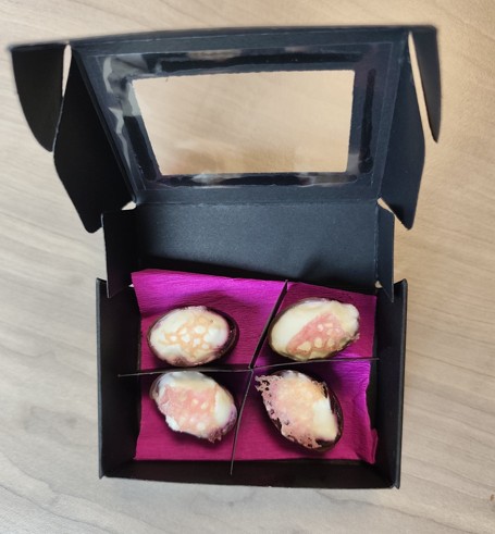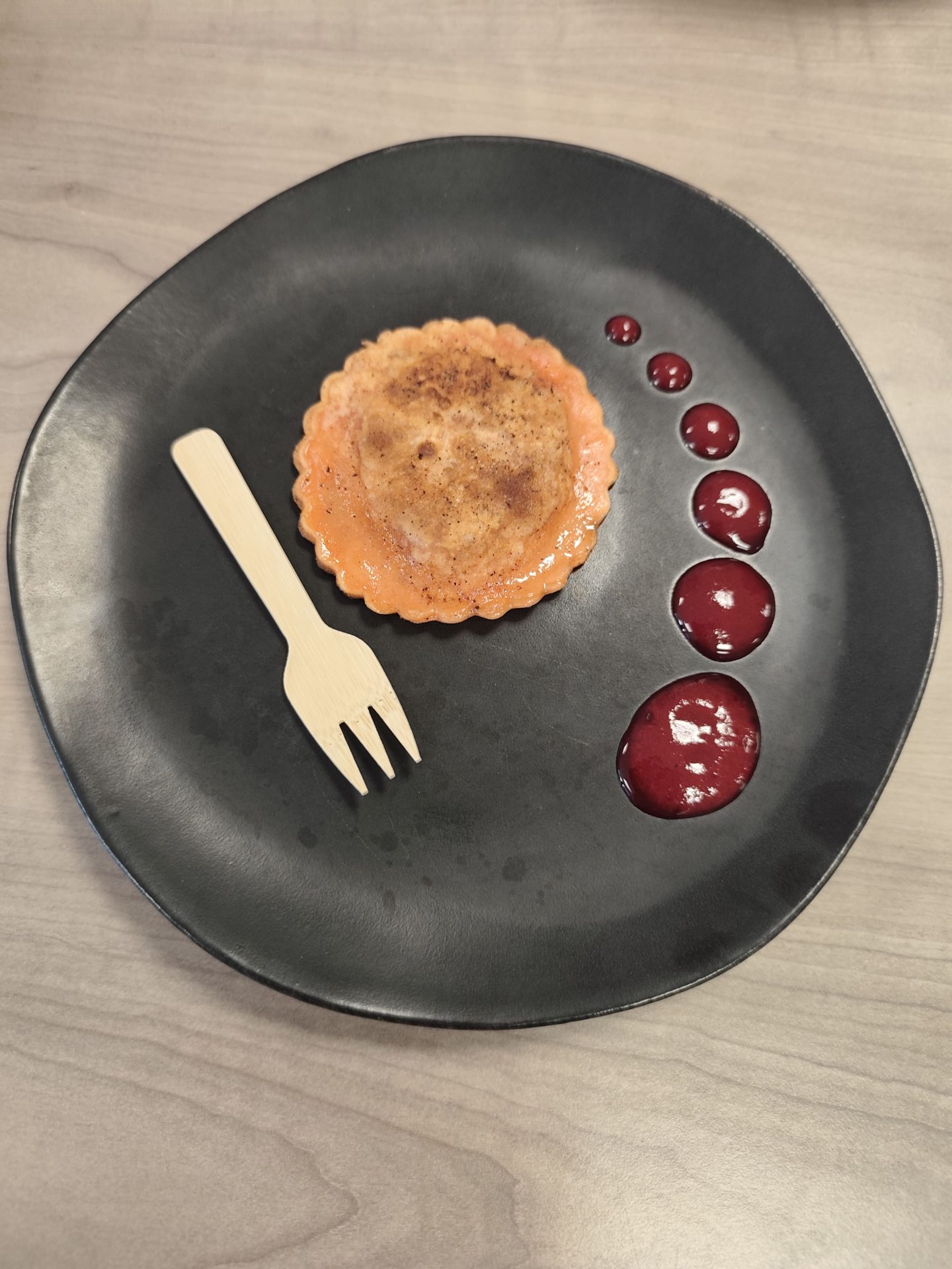 | Raviole sucrée garnie à la compote pomme/mangue. Avec avec un coulis de fruits rouges dans un petit pot. | POMANGO | 2025 BAC | ![]() |
